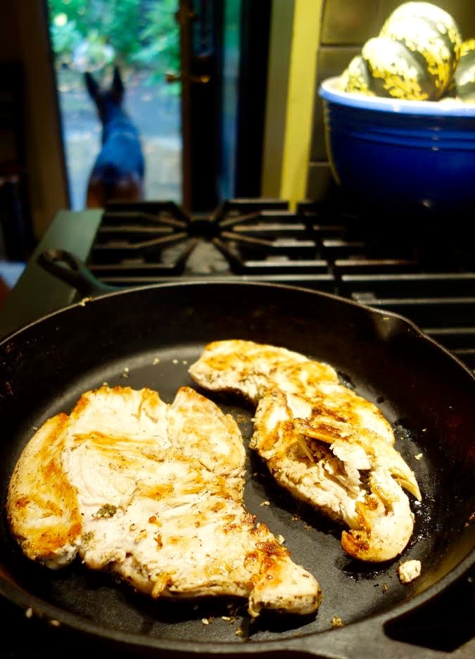 So Seattleites don’t like hot weather. This summer we experience record-setting heat which sent everyone out for air conditioners and forced us to learn to be creative about keeping our houses cool. One 95 degree evening my son stumbled out into the kitchen and asked, “Will there be any food served this evening?” I told him I was willing to turn the stove on for eight minutes and nothing more…voilà, chicken paillard! This is the perfect quick-cook light dinner or lunch.Remove chicken and from refrigerator and let come to room temperature. This will reduce cooking time to about 6 minutes from 8, if cold.