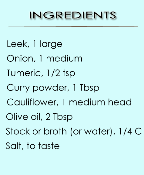 Slice leek into 1/4 inch rounds, using some of the green portion so not to waste and create color and texture. Give onion a medium to fine chop. Add both to pan with turmeric, curry and 1 tablespoon olive oil (oil on pan bottom with turmeric and curry on top of leek/onion mixture).