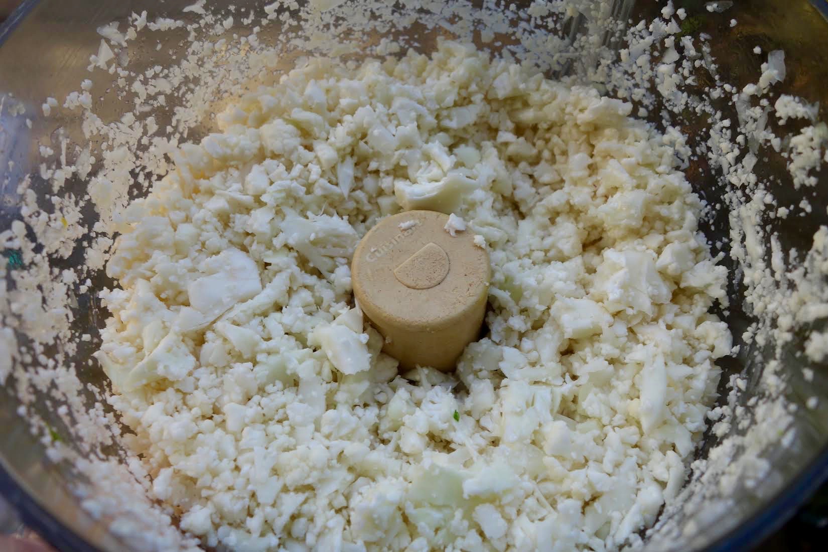 Break cauliflower into florets and place in Cuisinart or give a fairly fine chop. Add to pan, and continue cooking on medium-low for about five minutes until the cauliflower begins to turn color.