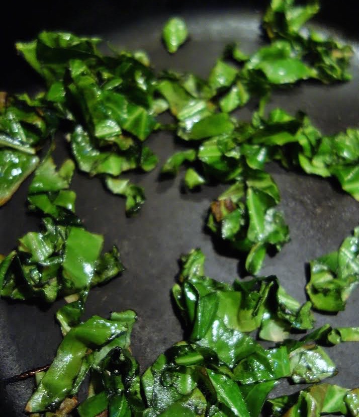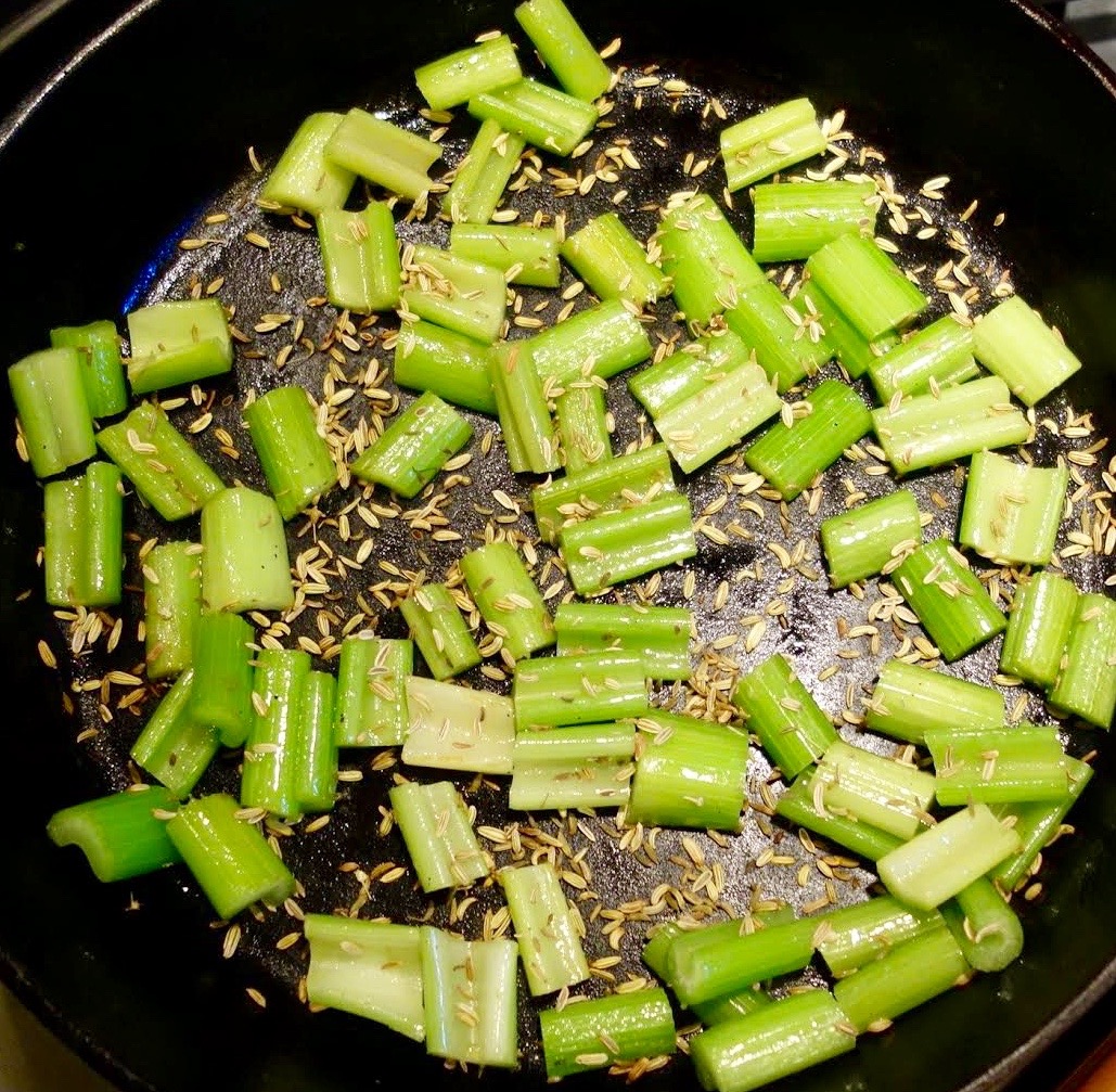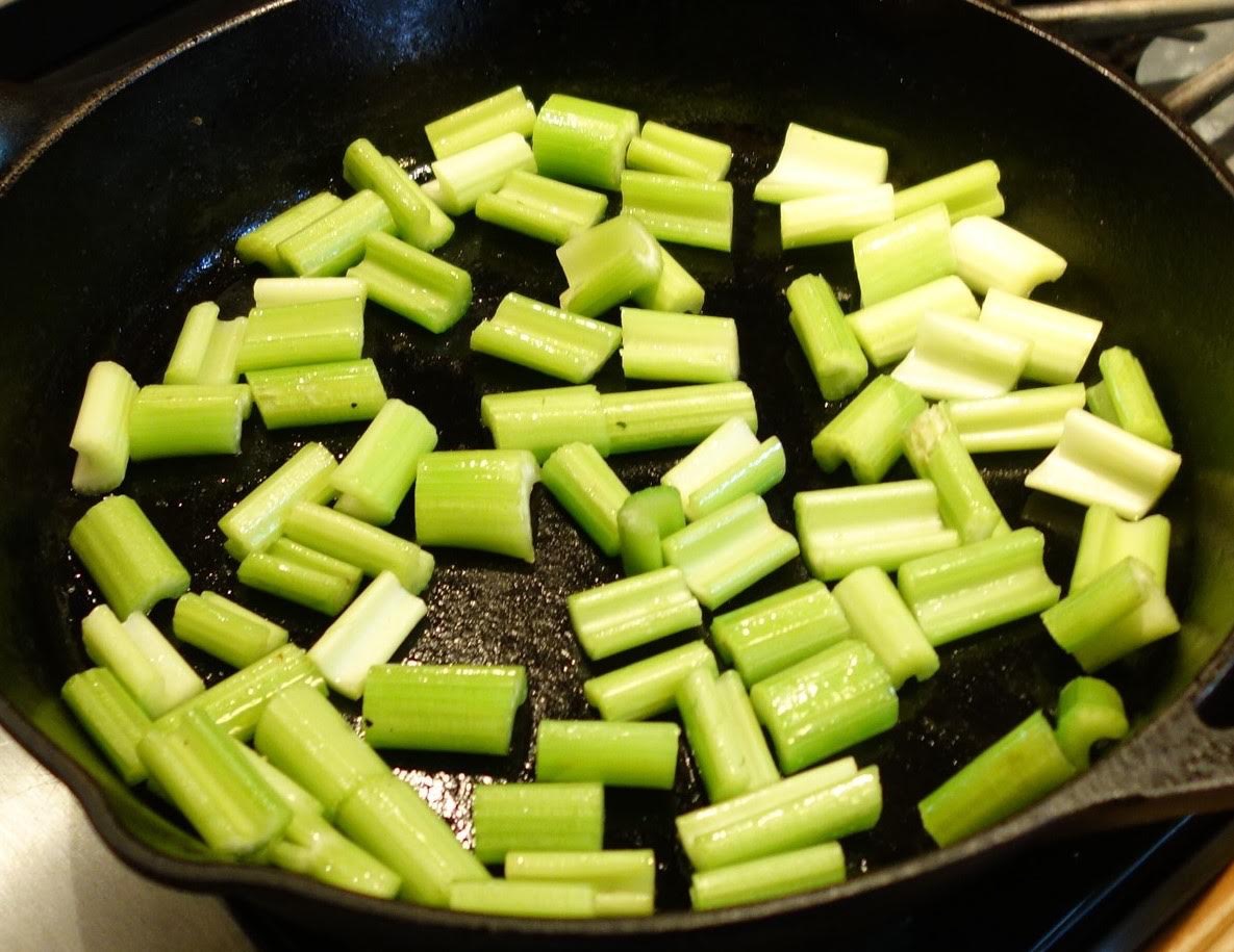 Rinse and lightly dry ribs of celery. Gather them together and remove bottom inch or two and save for broth making. Chop the remaining bunch into 3/4 inch sections. Warm pan and add 1 Tbsp olive oil. When oil heats, add your celery and sauté briefly until the oil has been absorbed.