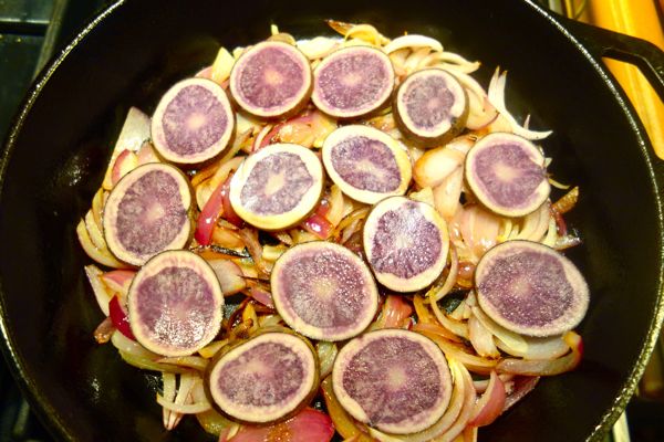 I usually don’t eat many root vegetables, but I couldn’t resist the patterns of the purple potatoes sitting on the counter. I sliced them thinly and placed raw slices on the onions. While the potatoes