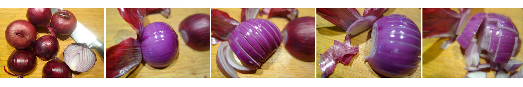 When slicing a pungent onion first cut lengthwise from stem to root and place the open sliced sides down on the cutting board. Use a sharp knife to avoid pressing down on the onion, and leave the root in tact (this is where the greatest concentration of eye-stinging compounds are located). Next, trim the stem end and peel back the skin. Slice into sections or add horizontal cuts to form a dice. Having the root end intact helps hold the onion together for ease of slicing and reduces the eye sting. The last cut will remove the root end.