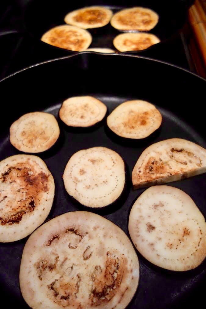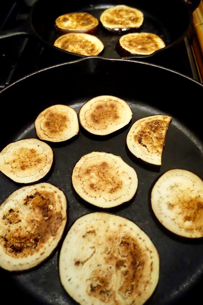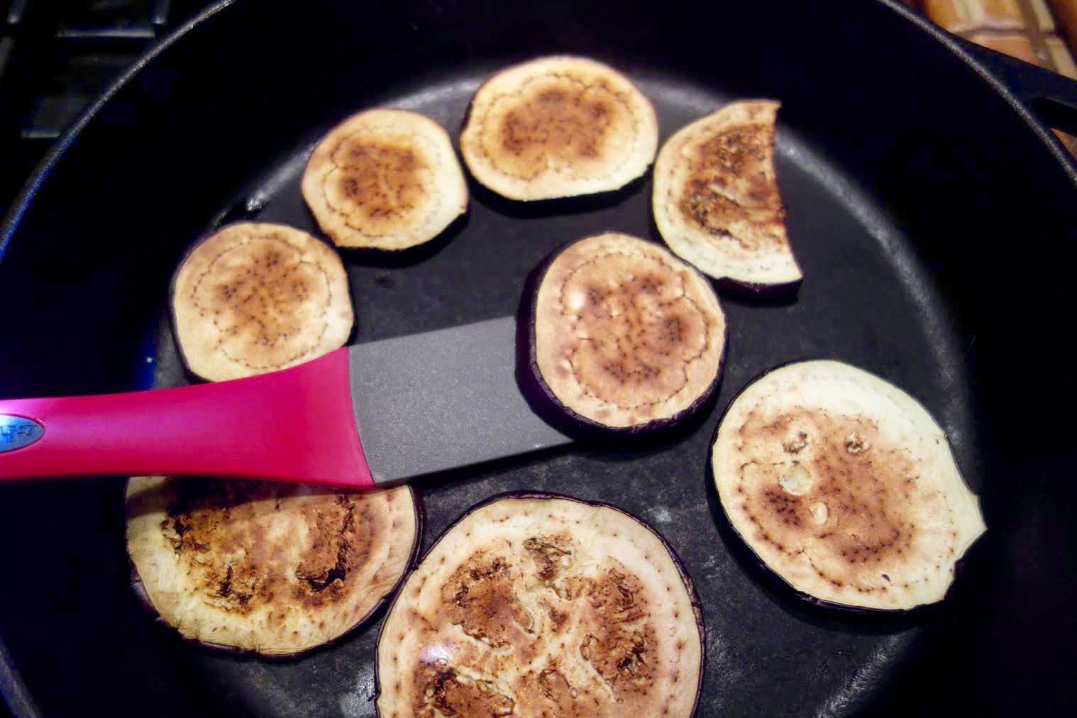 Heat a dry (seasoned) cast iron pan on medium and add the eggplant slices. As it cooks eggplant shrinks a bit so I continue adding more rounds or halved rounds to speed cooking time.
